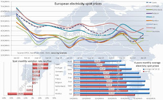 Bajan precio con respecto a diciembre sólo 3 mercados: nórdicos (con fuerza), Reino Unido y Holanda (muy ligeramente) el resto suben, los que más los ibéricos seguidos de Alemania (los que estaban más abajo el mes pasado).Mes barato para todos los mercados, si comparamos su spot con la media de los 4 últimos eneros. Especialmente para nórdicos, Reino Unido y Francia.